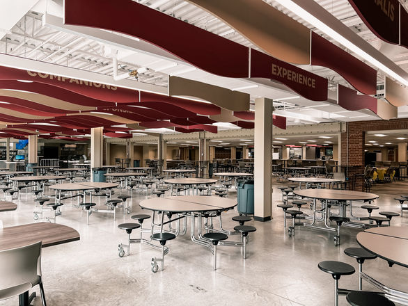 A new student center addition including a new kitchen and cafeteria, new classrooms, a center for diversity, additional staff offices, and open collaborative study areas for students. The cafeteria has direct access to outside dining for students during the weekday, and extracurricular activities for parents and visitors during sporting events, musical performances, and social gatherings.